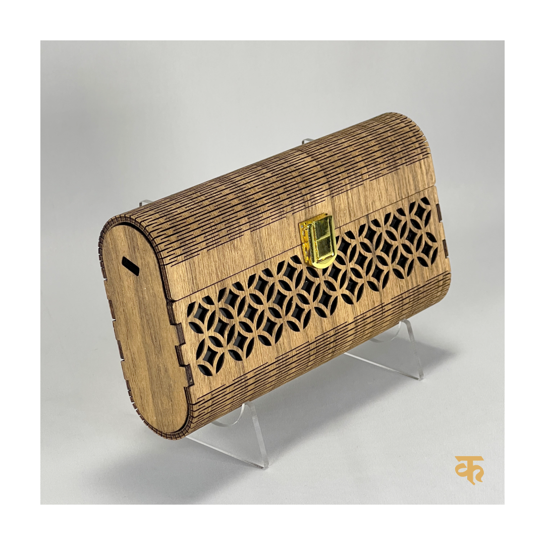 Step into the world of timeless elegance with our Wooden Hand Clutch adorned with mesmerizing Black Acrylic Backdrop! Crafted with care and attention to detail, this masterpiece seamlessly combines the earthy charm of wood with the contemporary allure of acrylic.
