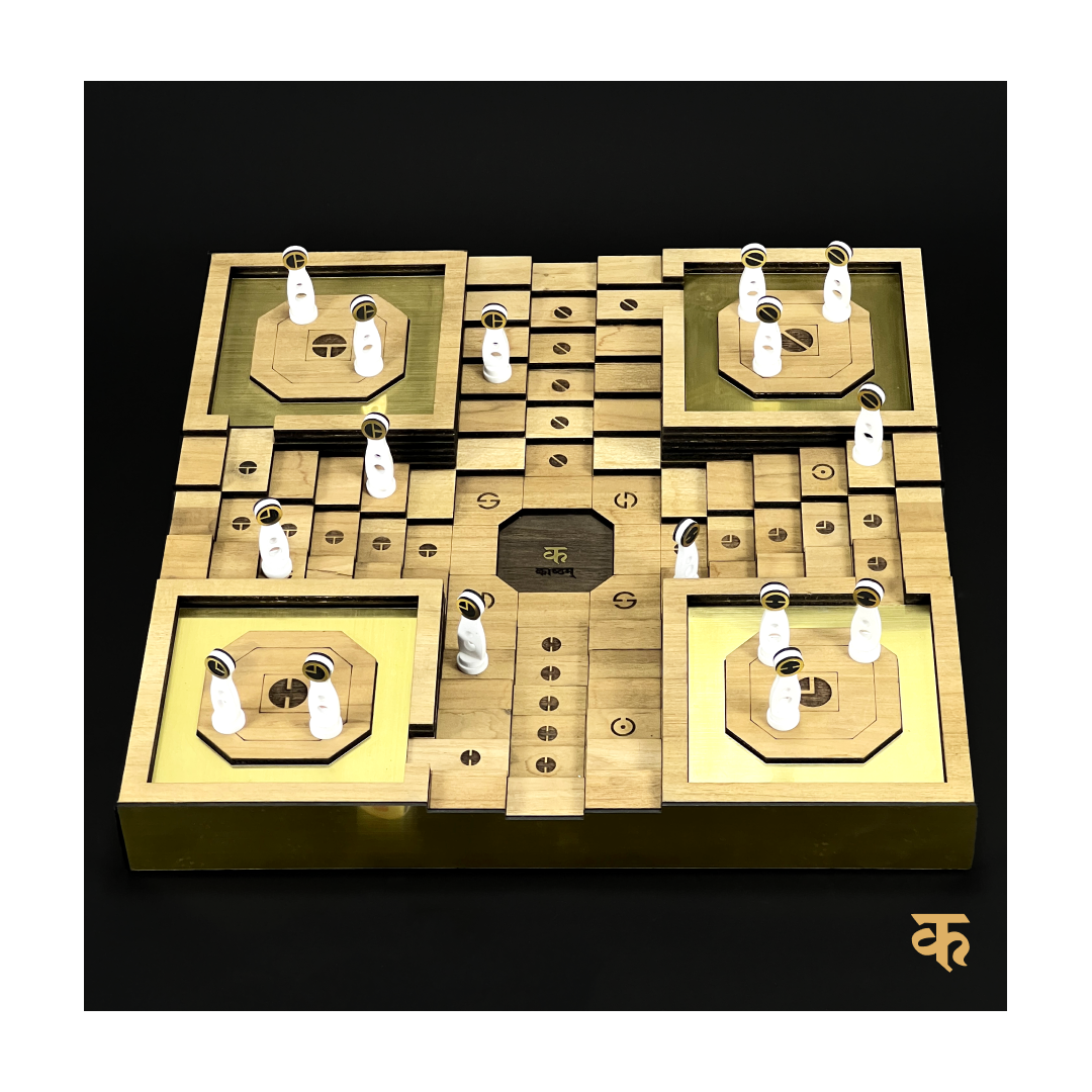 Enhance your entertainment with Ludo, a classic game made of wood and accented with golden acrylic. Enjoy the quality materials and elegant design as you strategize your way to victory. Perfect for family game nights or gatherings with friends.